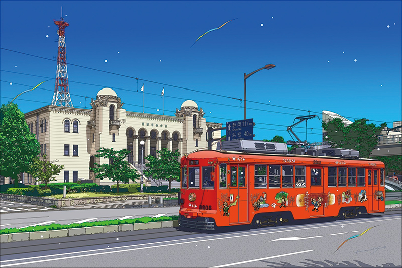 シティポップの時代を彩ったイラストレーター鈴木英人が描く豊橋の市電と公会堂。