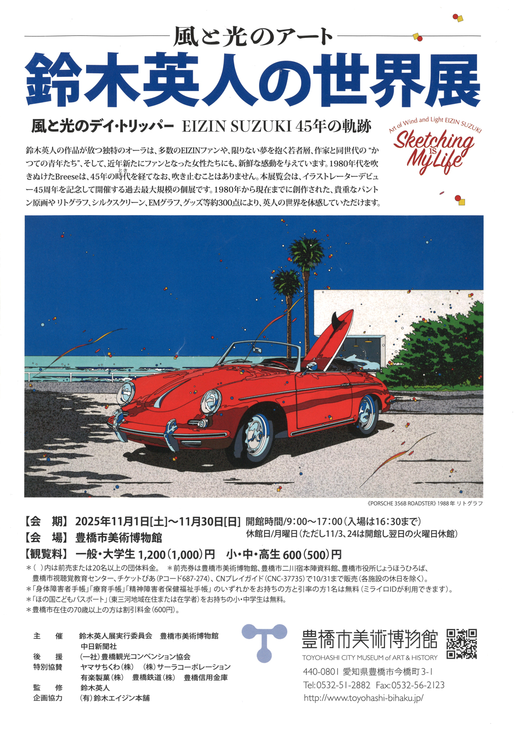 今でも鈴木英人氏のイラストを見ると青春時代の記憶が鮮やかによみがえります。青い空、海、ヤシの木、オープンカーなどロンサムボーイ片岡義男の小説の中のようなイラストは四十五年前のウキウキした気持ちにさせてくれます。そしてなんと、なんと! 『風と光のアート鈴木英人の世界展』が豊橋美術博物館で十一月一日から十一月三十日まで開催されます!鈴木英人氏の祖父が愛知県田原市出身ということで、ご縁が深い豊橋で開催いただけることになりました。そして、豊橋のシティプロモーションの四大コンテンツの中から、手筒花火と路面電車&公会堂の二枚のオリジナル画を制作いただきました。これだけまとまって、鈴木英人の世界観に浸れることはありませんよ。ぜひ、皆さん十一月中に豊橋に遊びに来てください。お帰りには、広小路でんでんにておでんをご堪能ください。